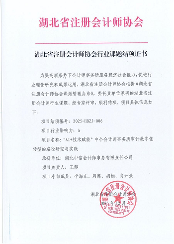 湖北中信会计师事务所承研的2025年湖北省注册会计师协会行业课题顺利结项